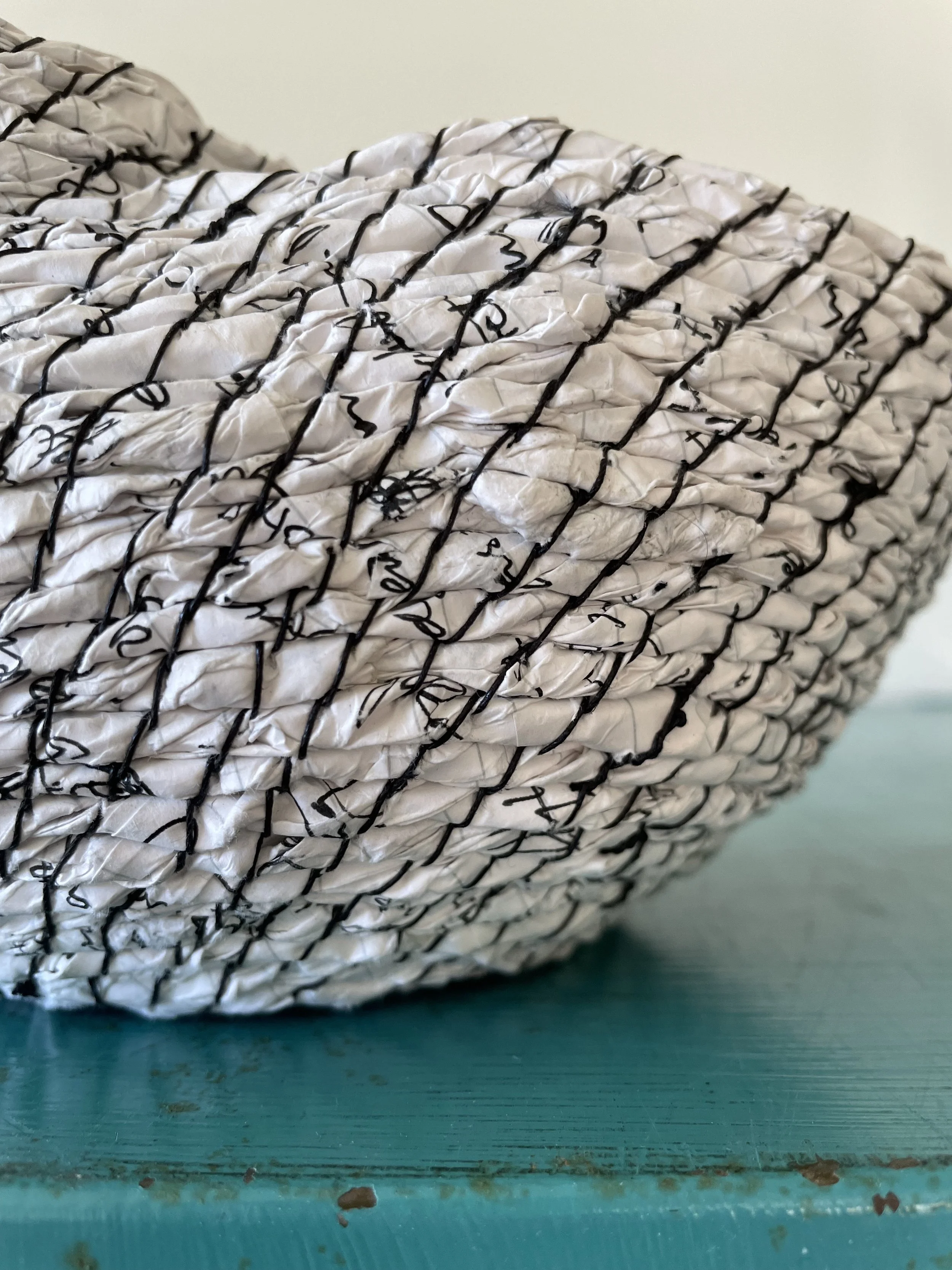 Waxed linen thread and paper cord spun from to-do lists.