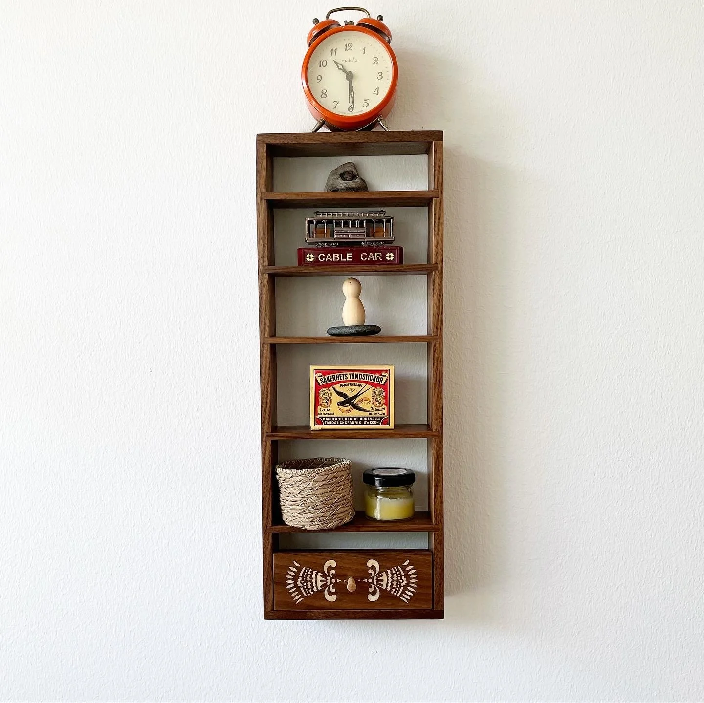 Walnut shelf and tiny drawer with maple inlay and brass hangers.