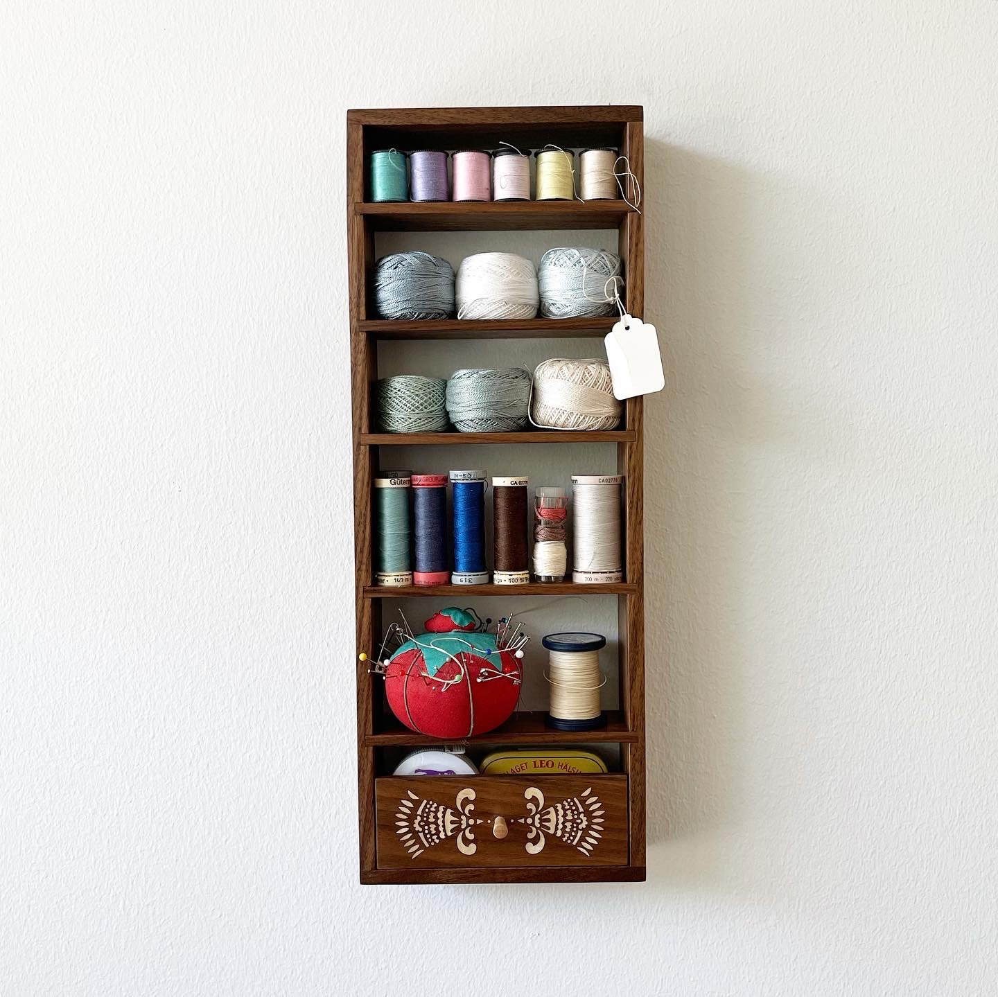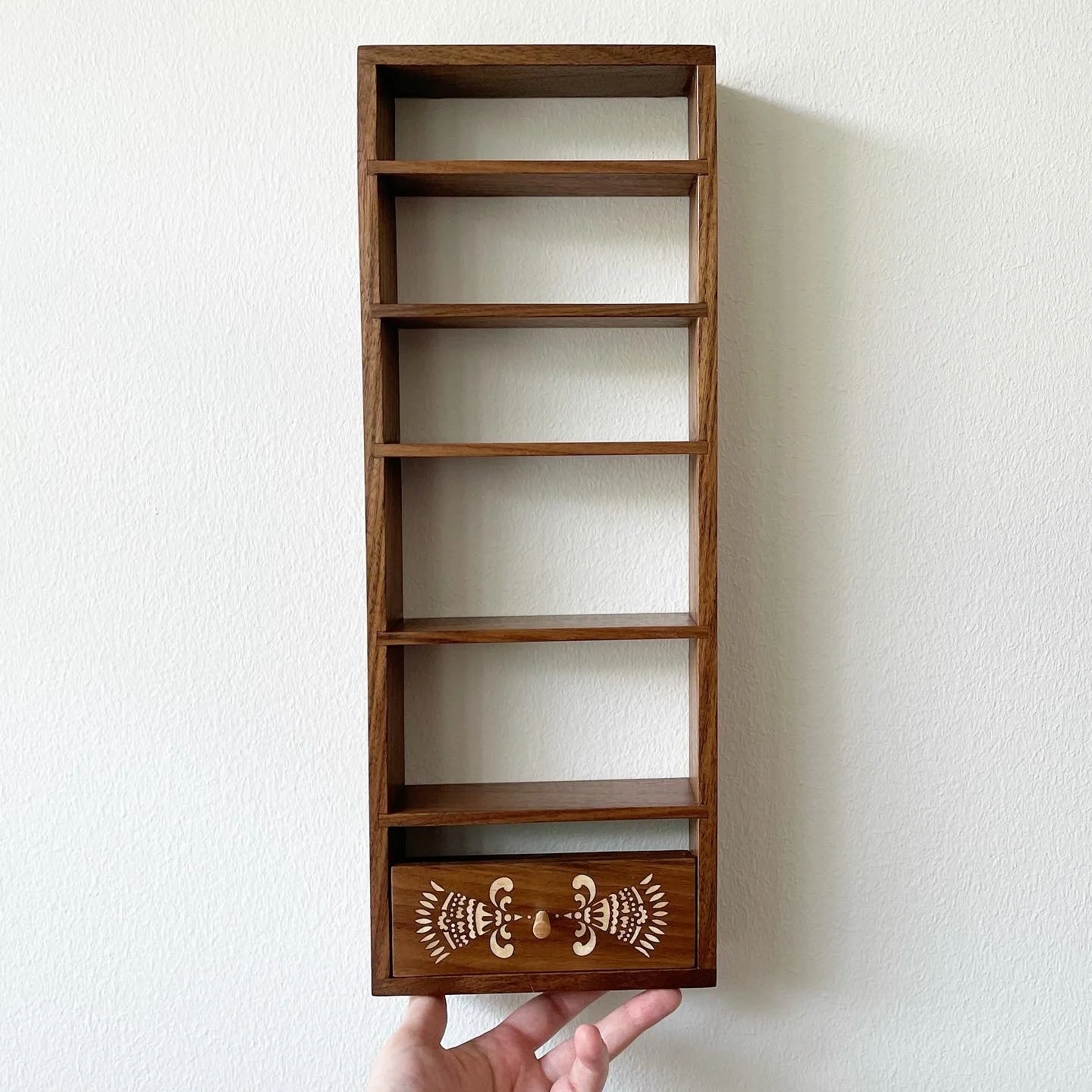 Originally designed to house my quilting thread, I’m really into it for displaying and storing any small things! Dovetails are a strong and pretty detail at each corner, and drawing practice became this folk art inlay with the help of lasers and tweezers. Most of the drawings I’ve sketched are of tiny cabinets like this one. I love making furniture that can be treasured for a lifetime, without needing much space to house it, or a truck to move it.