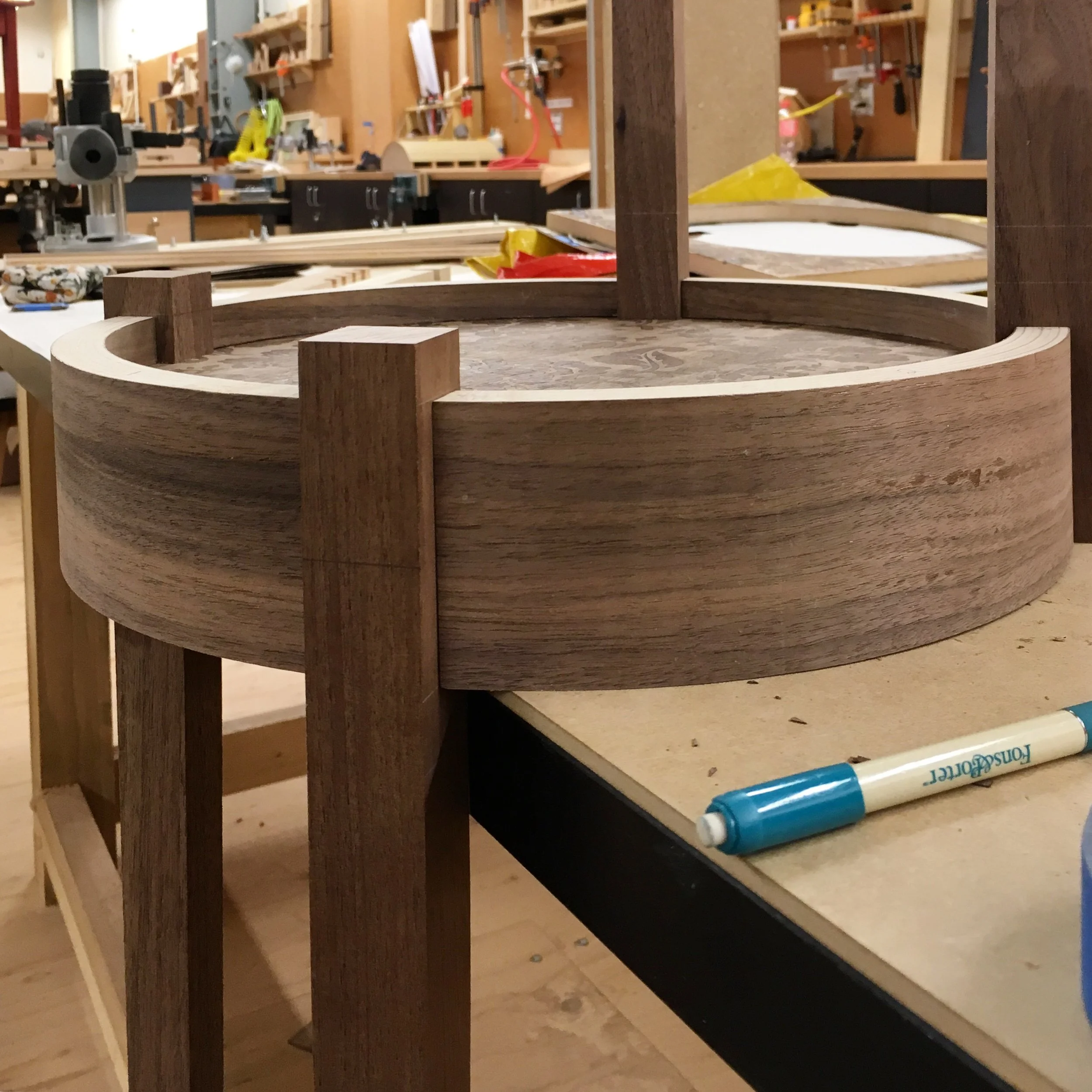 Bent laminations of solid walnut conceal the layers of wiggle wood and veneer that make the curved sides of this table. For strength, the legs notch into the table top and are attached to the sides with biscuits. The flowers are walnut and wenge veneers, laser cut to snap together like an elaborate puzzle, then pressed in a vacuum bag. Even so, the primary engineering challenge is actually invisible: a channel supporting the table top was integrated into the curved sides while they were bent over a form rather than being cut after construction.